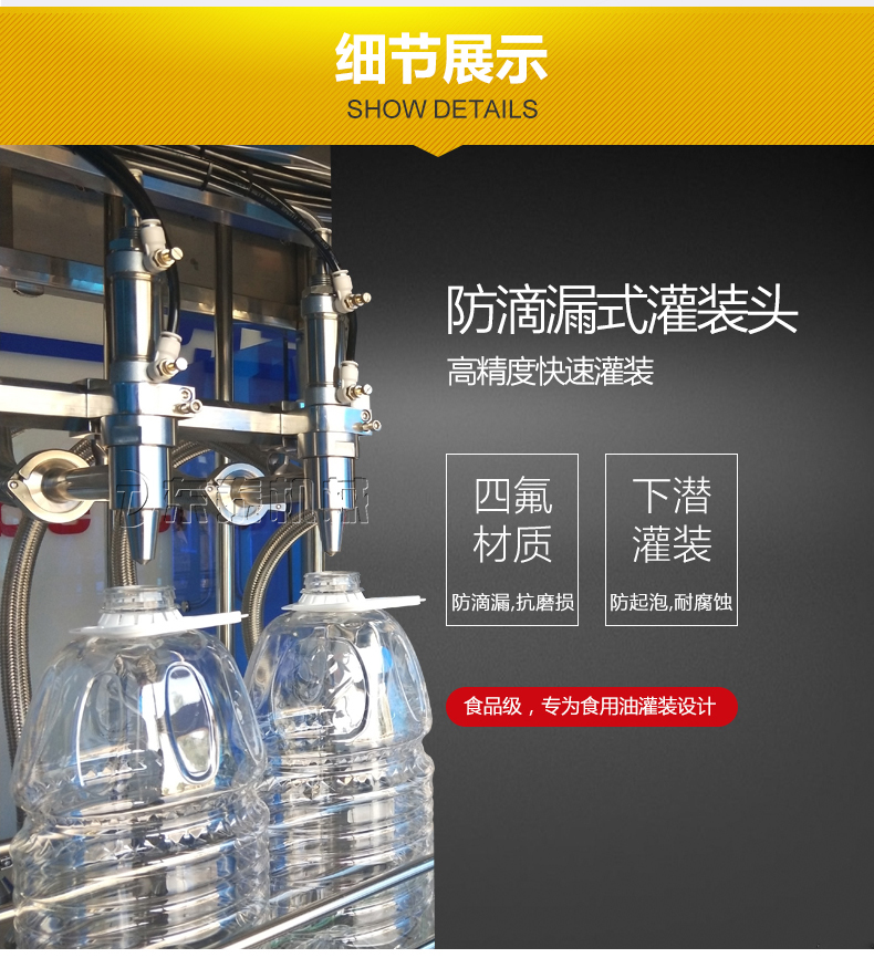 該系列食用油灌裝機(jī)采用流量計(jì)式計(jì)量灌裝原理,多項(xiàng)技術(shù)認(rèn)證,適用于各種規(guī)格(1-5 升)的南瓜籽油、榛子油、牡丹籽油、芝麻油、核桃油、山茶油、亞麻籽油、棉籽油、橄欖油、大豆油、玉米油、菜籽油等食用油灌裝。設(shè)備采用高精度的旋轉(zhuǎn)編碼器計(jì)量,保證了 1‰的灌裝精度,在保證灌裝精度的同時(shí),提高了20%-35%的灌裝速度,操作簡(jiǎn)單,維護(hù)方便,節(jié)省人工成本,生產(chǎn)效率更高。